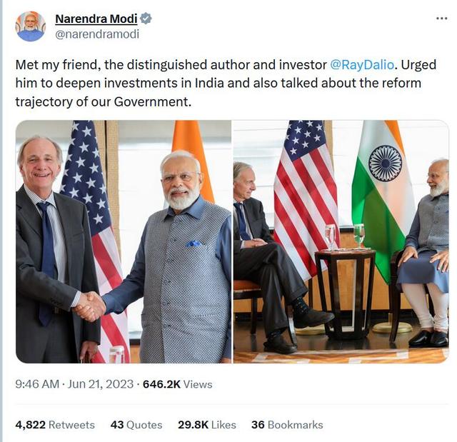莫迪也在会面后发推称:“刚见了我的一又友,知名作者和投资者达利欧。我邀请他加大对印度的投资,还谈到了咱们的政府矫正。”